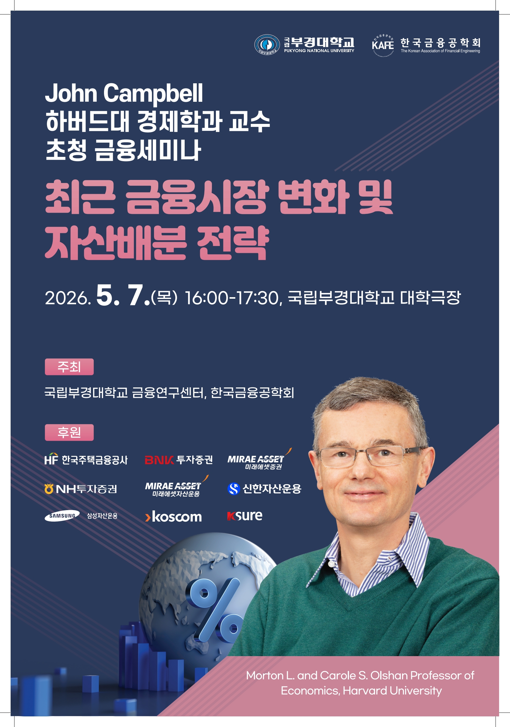 국립부경대학교 금융연구센터·한국금융공학회 초청 금융세미나 개최 국립부경대학교 금융연구센터와 한국금융공학회는 세계적 금융경제학자인 John Y. Campbell 교수(하버드대학교 경제학과)를 초청하여 금융세미나를 개최합니다. Campbell 교수는 자산가격, 장기투자, 채권시장, 주식시장, 가계금융 분야에서 탁월한 연구성과를 쌓아온 석학으로, 전미경제학회(AEA), 전미재무학회(AFA) 회장을 역임하였습니다.